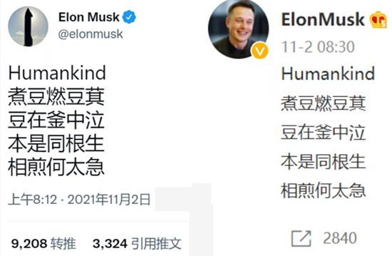 特斯拉CEO马斯克11月2日在推特、微博个人帐号上发了一首曹植的《七步诗》,“本是同根生,相煎何太急。”诗句前马斯克还加了“Humankind(人类)”一词。这波突如其来的操作,他究竟想表达什么?彻底勾起了海内外网友的好奇心,大家纷纷留言讨论。