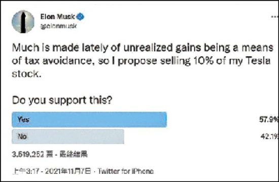 马斯克6日在推特上发起投票,询问网友是否应该出售手中10%的特斯拉股票,并表示会遵从投票结果。该投票在美东时间7日下午结束,有近352万网友参与,并有57.9%支持马斯克沽售股票。