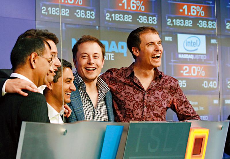 图:2010年特斯拉首次公开募股,马斯克(右二)及公司高层合影留念。\路透社