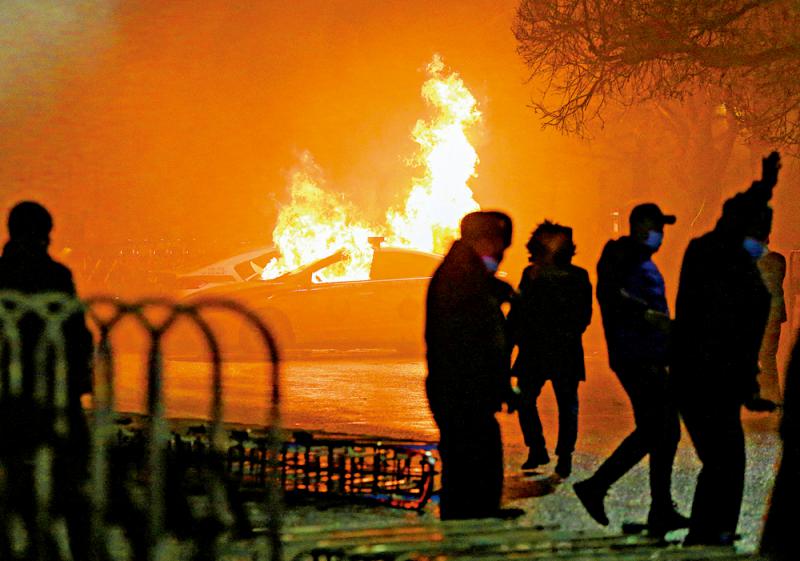 图:5日凌晨,示威者在阿拉木图烧毁汽车。\路透社