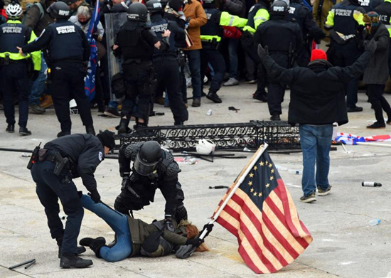 图:警察去年1月6日拘捕强闯美国国会的暴徒。\法新社
