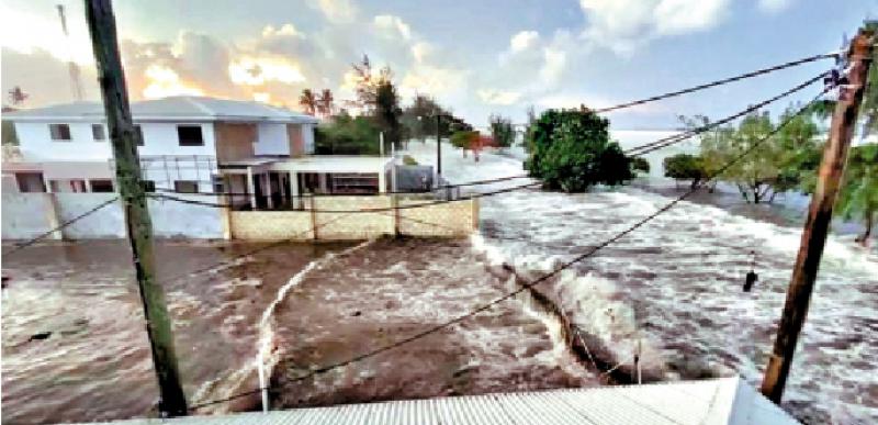 图:汤加14日火山喷发后,社媒视频显示当地房屋被海水淹没。\网络图片