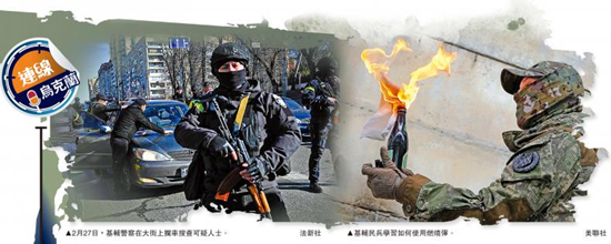 左图:2月27日,基辅警察在大街上拦车搜查可疑人士。/法新社;右图:基辅民兵学习如何使用燃烧弹。/美联社