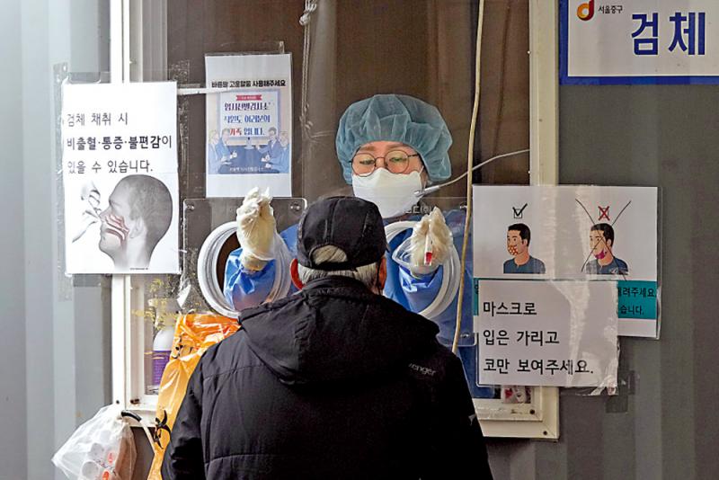 图:韩国首尔医护17日采集受检者的鼻拭子样本。\美联社