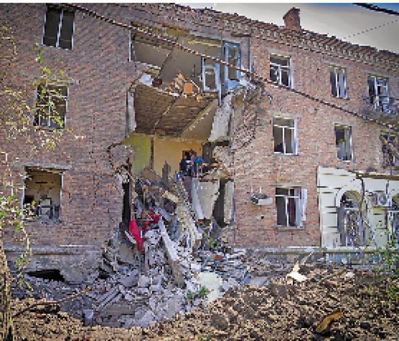 图:顿涅茨克巴赫穆特市中心建筑1日被火炮损毁。\美联社