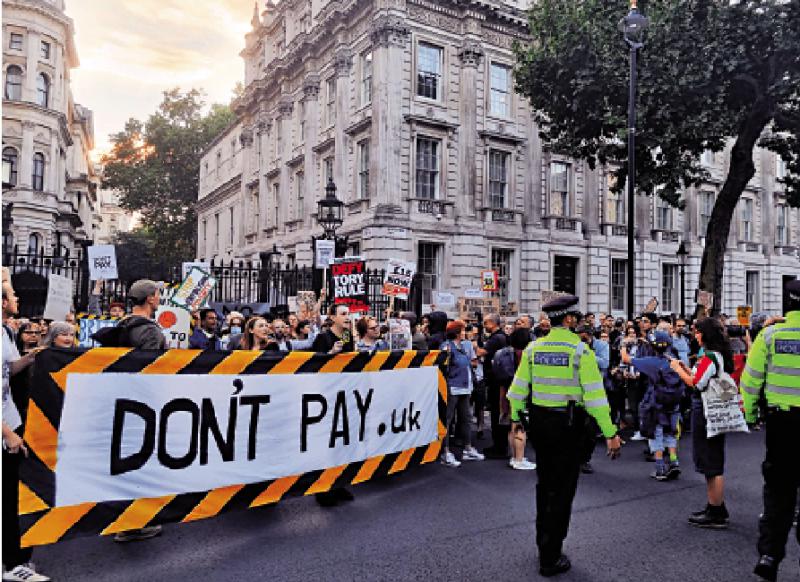图:英国民众6日在唐宁街附近举行“不付钱”抗议活动,抵制天然气和电力供应商加价。\网络图片