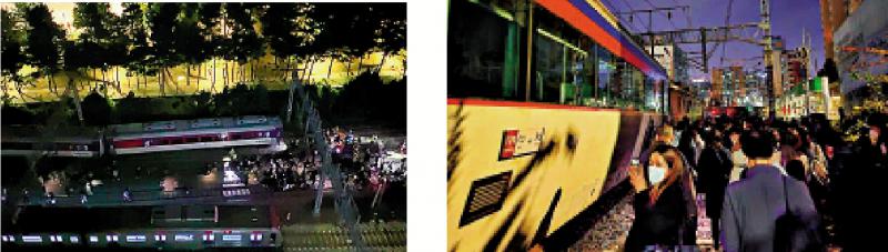 左图:韩国首尔6日突发列车出轨,造成至少31人受伤。\网络图片 右图:列车出轨后,部分乘客步行撤离。\网络图片