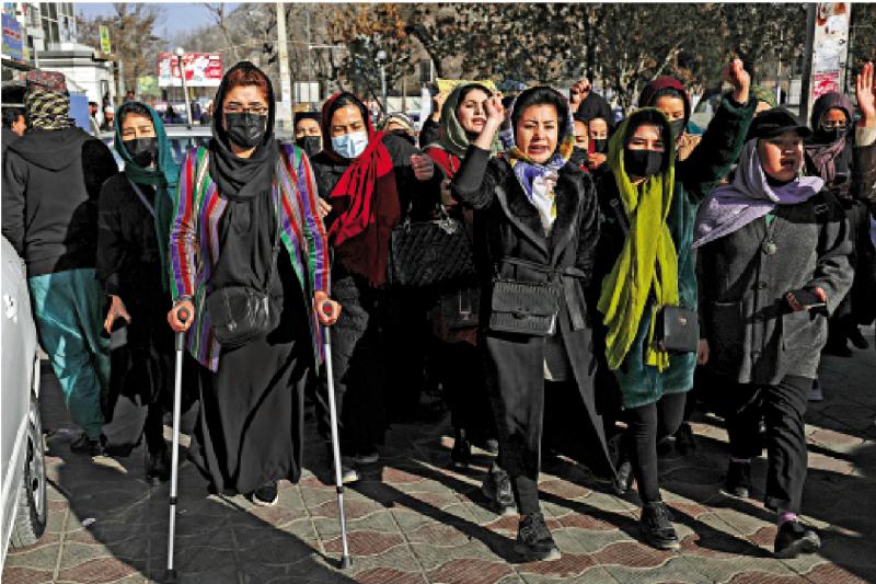 图:阿富汗女性22日在喀布尔示威,抗议塔利班限制她们的权利。\美联社