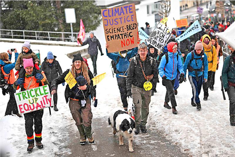 图:示威者15日在达沃斯聚集,要求对富人征税,用于解决气候问题。\法新社