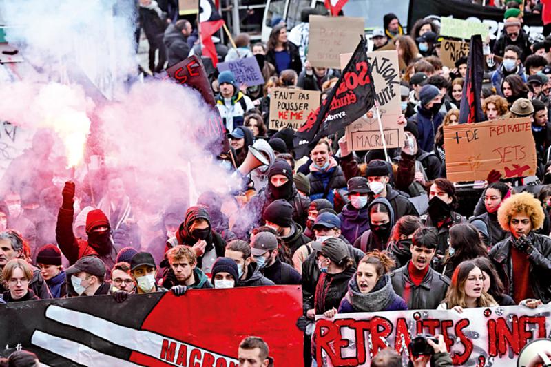 图:1月31日,大批示威者在法国西部城市南特抗议改革退休金制度。\法新社
