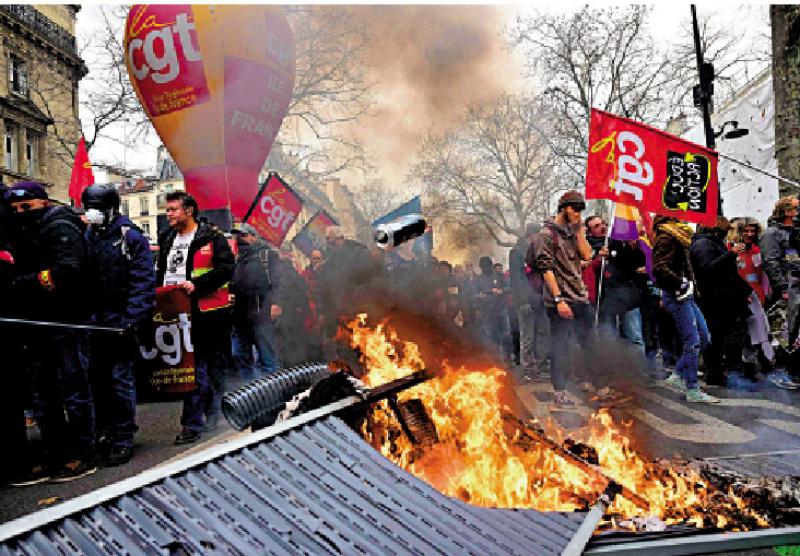 图:法国巴黎的示威者11日在街头焚烧物品。/法新社