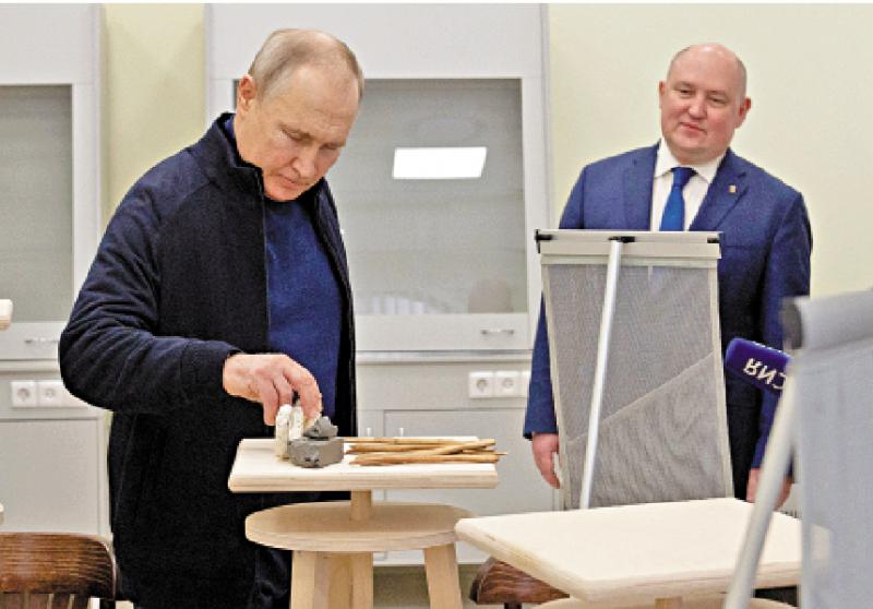 图:普京(左)18日参观克里米亚一所儿童中心。\路透社