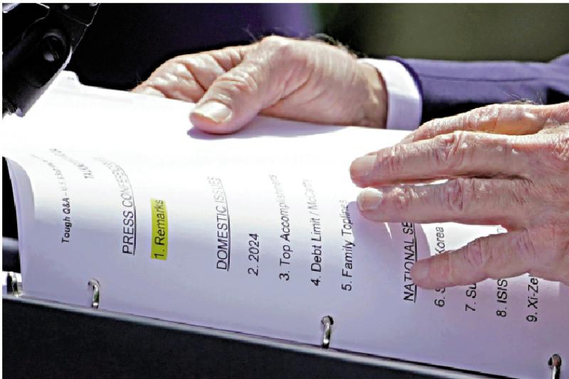 图:美国总统拜登26日拿着的猫纸列明记者会上“艰难的问题”。\美联社