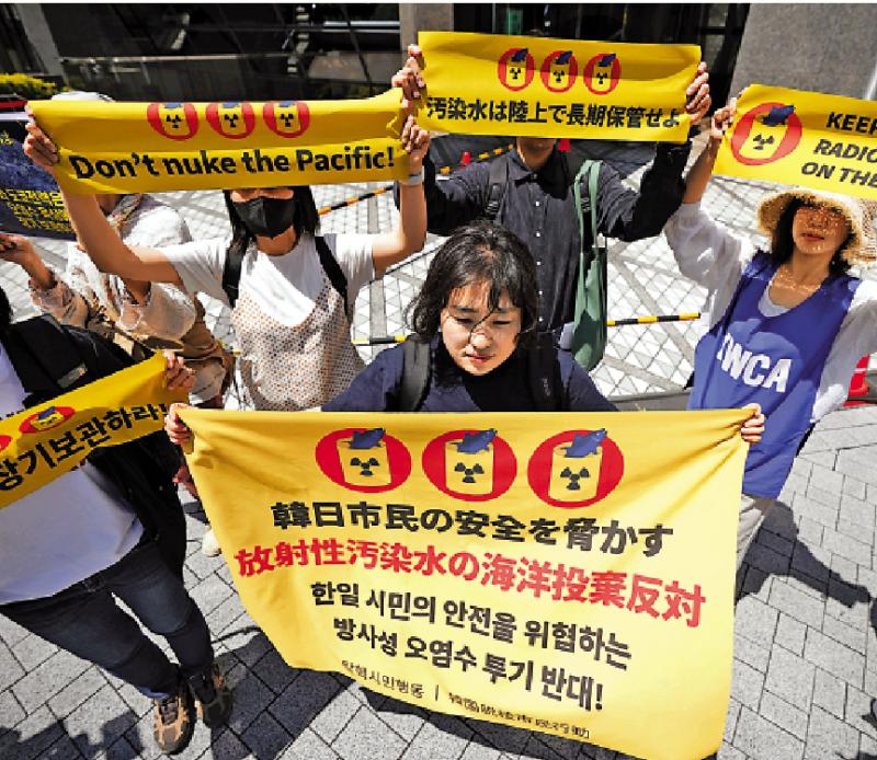图:日韩民众16日聚集在东电总部大楼外,反对核污水排海计划。/美联社