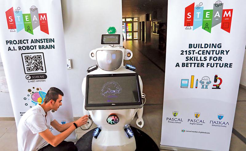 图:一名塞浦路斯高中生使用由ChatGPT驱动的机器人。\路透社