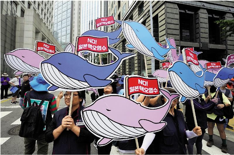 图:韩国民众6日举行新一轮反对核污水排海的示威活动。\美联社