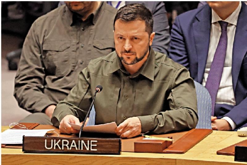 图:泽连斯基20日在联合国安理会会议上发言。\法新社