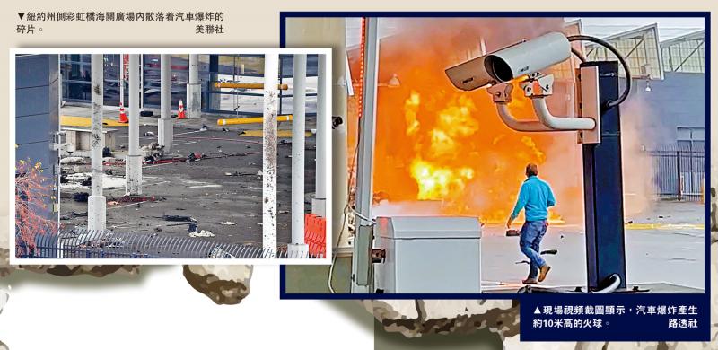 左图:纽约州侧彩虹桥海关广场内散落着汽车爆炸的碎片。\美联社;右图:现场视频截图显示,汽车爆炸产生约10米高的火球。\路透社
