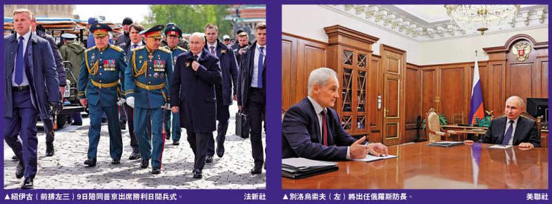 左图:绍伊古(前排左三)9日陪同普京出席胜利日阅兵式。\法新社;右图:别洛乌索夫(左)将出任俄罗斯防长。\美联社