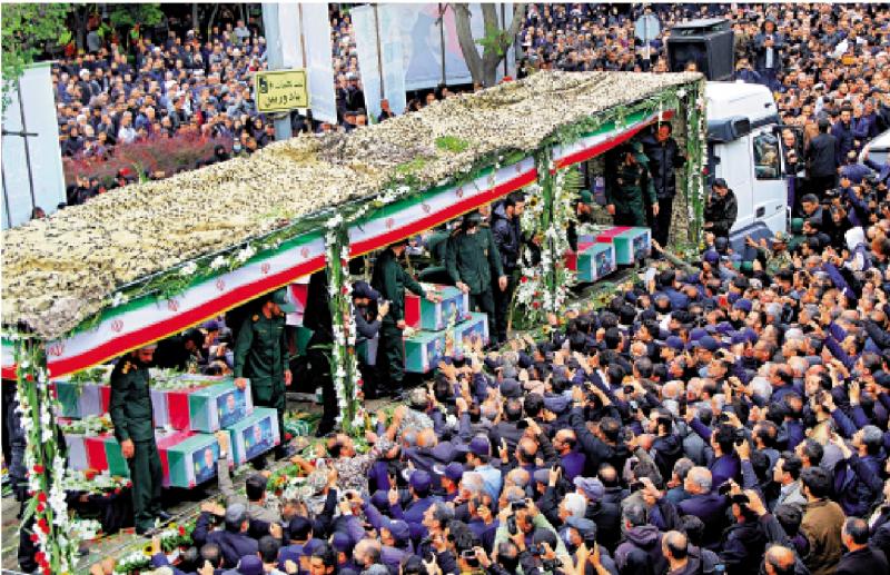 图:伊朗民众围住装有莱希及其他遇难者灵柩的车子致哀。\美联社