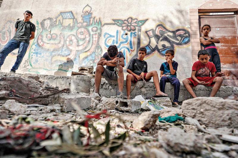 图:以军频繁轰炸加沙地带,巴勒斯坦孩童在废墟前呆坐。\法新社