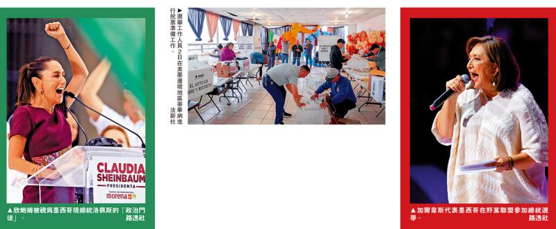 图:(左)欣鲍姆被视为墨西哥现总统洛佩斯的“政治门徒”。/路透社;(中)选举工作人员2日在美墨边境地区蒂华纳进行投票准备工作。/法新社;(右)加尔韦斯代表墨西哥在野党联盟参加总统选举。\路透社