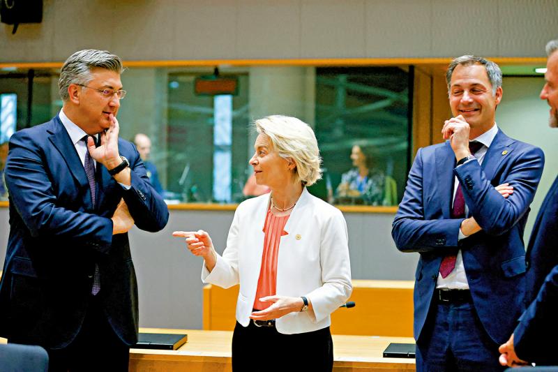 图:欧盟委员会主席冯德莱恩(中)17日与克罗地亚总理普连科维奇(左)和比利时首相德克罗(右)交谈。\路透社