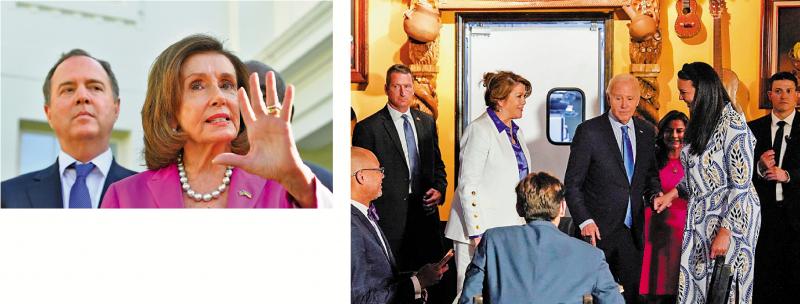 左图:加州民主党众议员希夫(后)17日公开呼吁拜登退选;佩洛西也暗示拜登应放弃竞选连任。\法新社;右图:拜登17日在拉斯维加斯一家餐厅向民众打招呼。\法新社