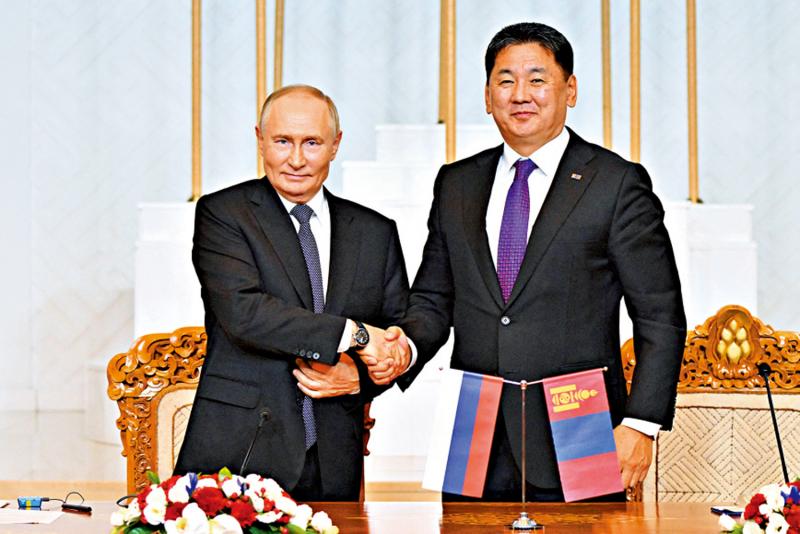 图:普京(左)与蒙古国总统呼日勒苏赫3日在乌兰巴托会晤。\路透社