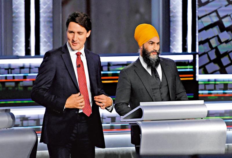 图:加拿大新民主党党魁辛格(右)不再支持特鲁多领导的自由党。\资料图片