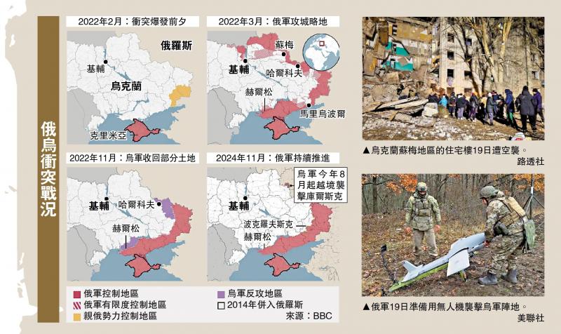11月19日:乌军使用ATACMS袭击布良斯克地区一个弹药库。同日,普京批准新版核威慑政策,若乌克兰用西方非核导弹攻击俄罗斯,俄方可用核武回应。