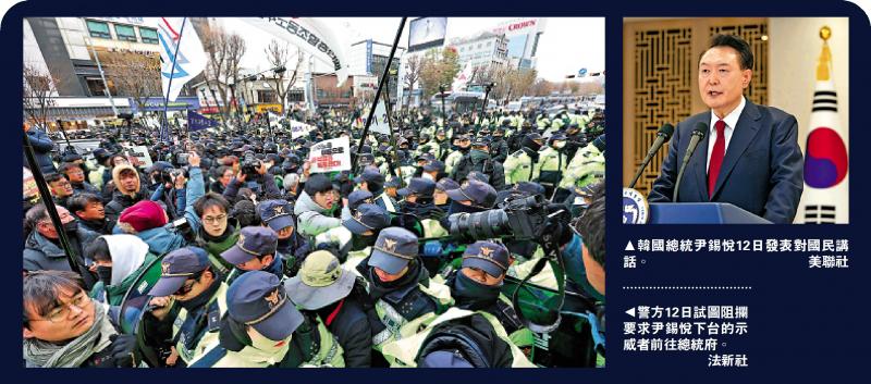 左图:警方12日试图阻拦要求尹锡悦下台的示威者前往总统府。\法新社 右图:韩国总统尹锡悦12日发表对国民讲话。\美联社
