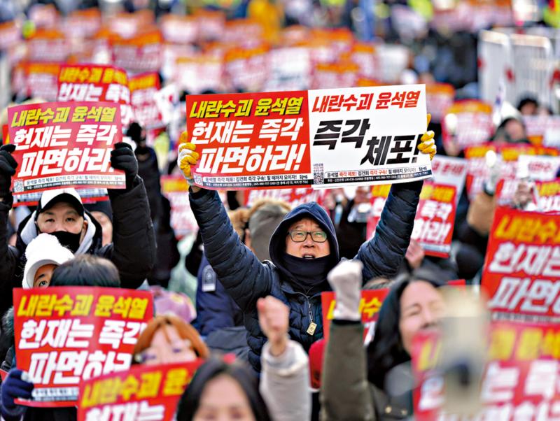 图:韩国民众15日在首尔示威,要求立即逮捕尹锡悦。\美联社