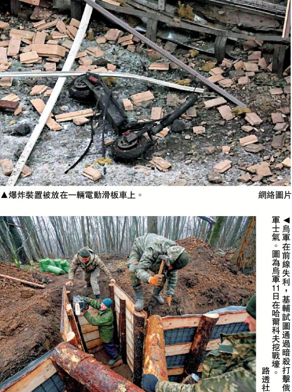 上图:爆炸装置被放在一辆电动滑板车上。\网络图片;下图:乌军在前线失利,基辅试图通过暗杀打击俄军士气。图为乌军11日在哈尔科夫挖战壕。\路透社