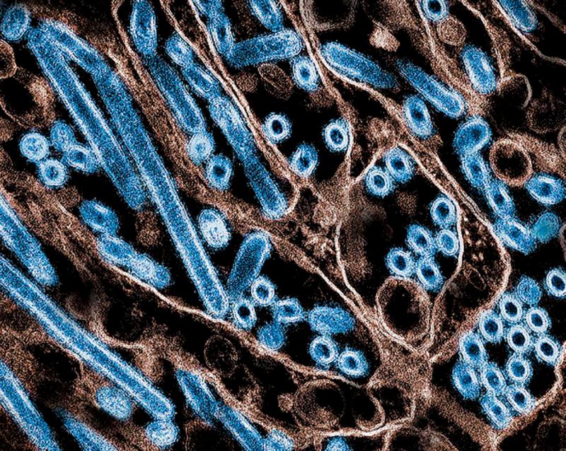 图:美国出现首宗H5N1禽流感人类死亡个案。图为电子显微镜下的甲型H5N1禽流感病毒颗粒(蓝色)。\法新社