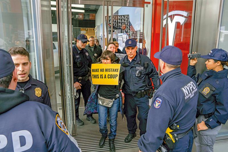 在纽约曼哈顿的一家特斯拉门市外,约300名示威者集会,警方逮捕了9人。