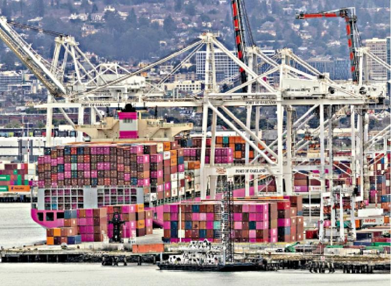 图:特朗普政府希望重振美国造船业。图为一艘货柜船停靠在加州奥克兰港。\路透社