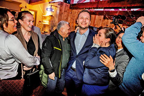 图:格陵兰民主党领导人尼尔森(左四)和党友及支持者庆祝胜选。\路透社
