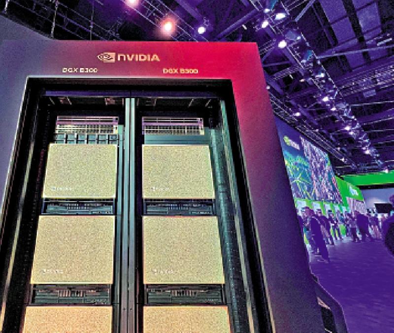 图:配置英伟达最新人工智能芯片的组件3月在加州亮相。\路透社