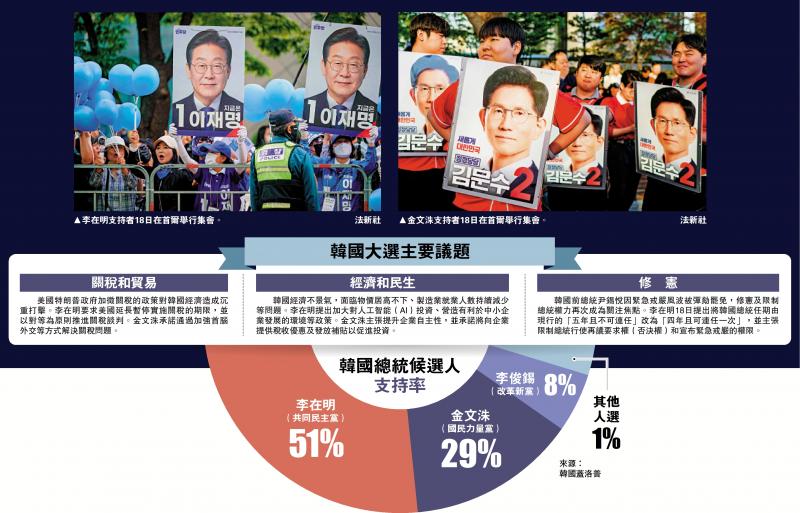 16日公布的最新民调显示,李在明支持率为51%,首次突破半数大关;执政党国民力量党候选人金文洙支持率为29%;改革新党候选人李俊锡支持率为8%。政党支持率方面,共同民主党为48%,国民力量党为30%。韩媒指出,这反映出前总统尹锡悦因紧急戒严风波被罢免后的韩国政治现状。尹锡悦17日宣布退出国民力量党,此举能否挽救金文洙的选情还有待观察。