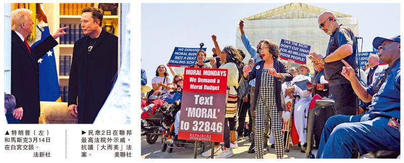 左图:特朗普(左)和马斯克3月14日在白宫交谈。\法新社;右图:民众2日在联邦最高法院外示威,抗议“大而美”法案。\美联社