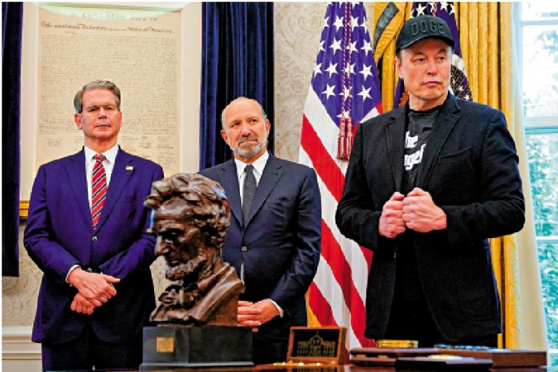 图:5月30日,美国财政部长贝森特(左)和马斯克(右)在白宫椭圆形办公室见记者/路透社
