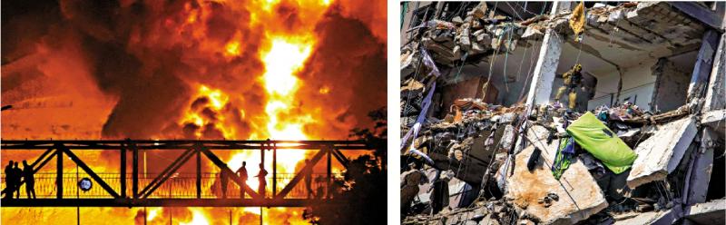 左图:伊朗首都德黑兰的沙赫兰油库15日爆炸燃起大火。\路透社;右图:以色列紧急救援人员15日在特拉维夫的遭袭现场搜寻遇难者。\法新社