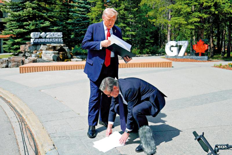 图:斯塔默16日在G7峰会会场捡起特朗普掉落的文件。\法新社