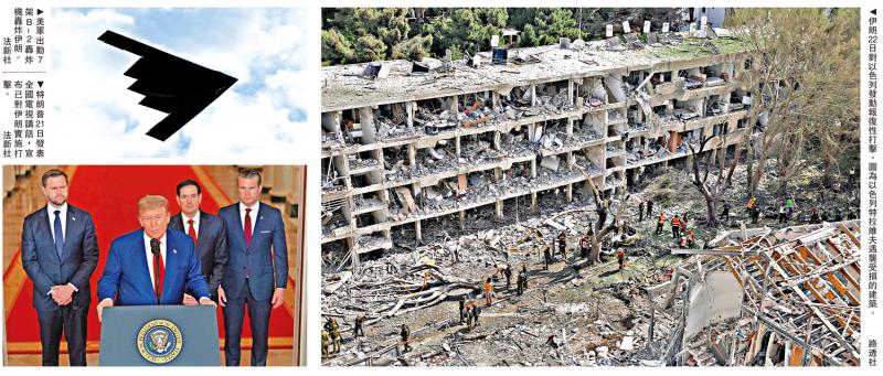 左上图:美军出动7架B-2轰炸机轰炸伊朗。左下图:特朗普21日发表全国电视讲话,宣布已对伊朗实施打击。\法新社;右图:伊朗22日对以色列发动报复性打击。图为以色列特拉维夫遇袭受损的建筑。\路透社