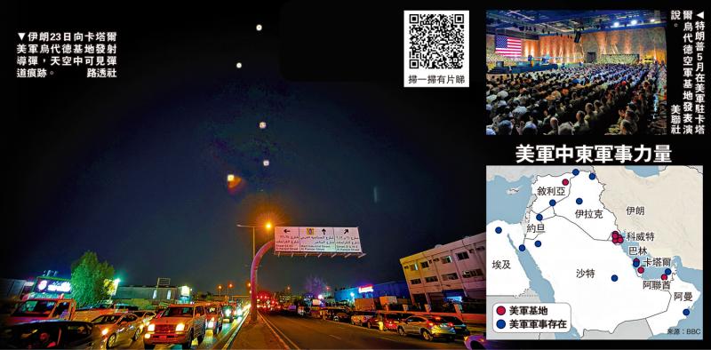 左图:伊朗23日向卡塔尔美军乌代德基地发射导弹,天空中可见弹道痕迹。\路透社;右图:特朗普5月在美军驻卡塔尔乌代德空军基地发表演说。\美联社