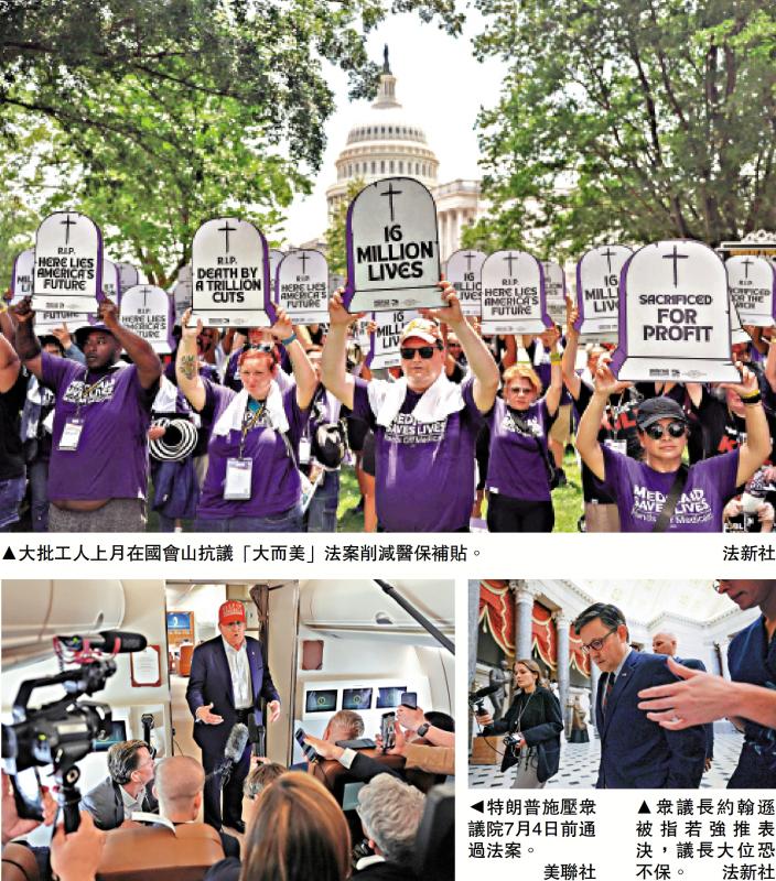 上图:大批工人上月在国会山抗议“大而美”法案削减医保补贴。\法新社;左下图:特朗普施压众议院7月4日前通过法案。\美联社;右下图:众议长约翰逊被指若强推表决,议长大位恐不保。\法新社
