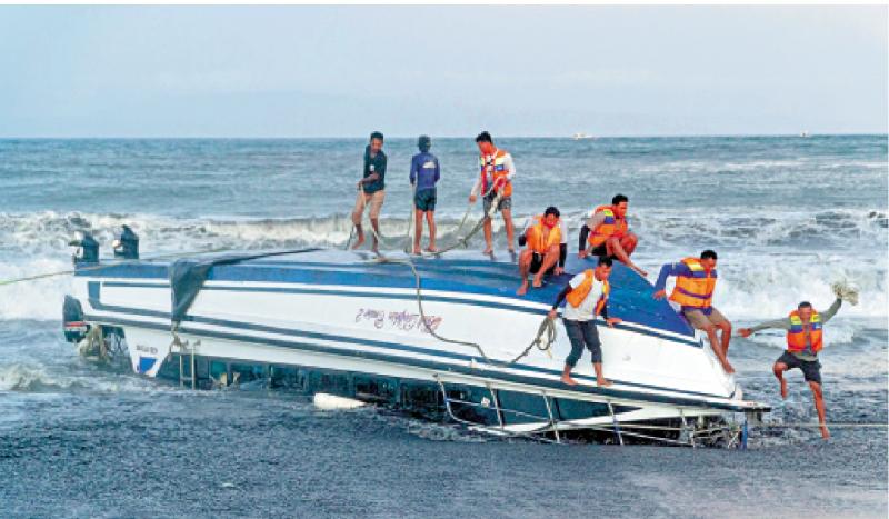 图:8月5日,在印尼巴厘岛,工作人员将倾覆快艇拉到岸边。\新华社