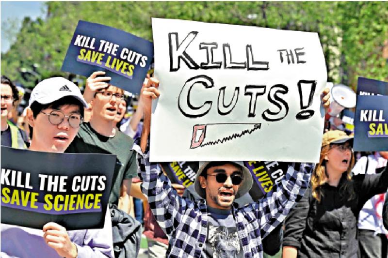 图:今年4月,美国UCLA的学生、研究人员示威抗议特朗普政府削减研究经费。\法新社