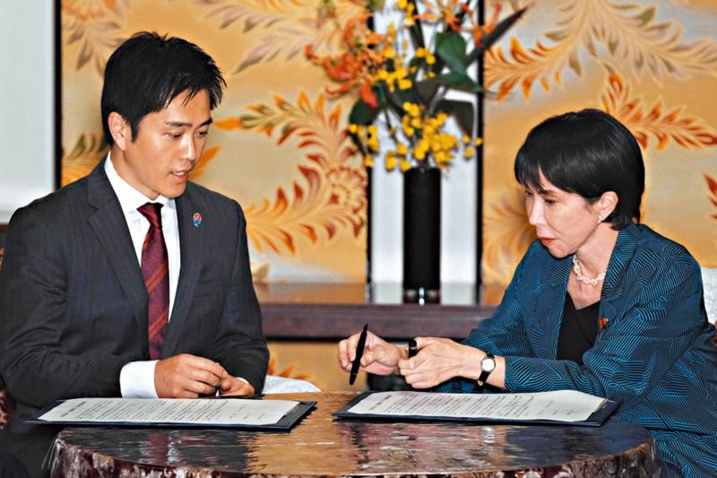 图:日本自民党总裁高市早苗(右)与日本维新会党首吉村洋文20日签署联合执政协议文件。\法新社